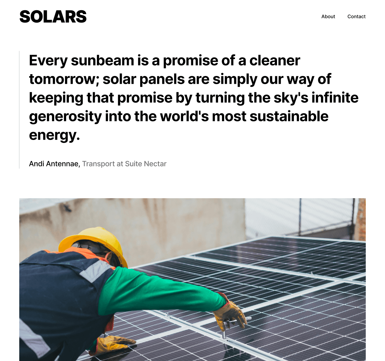 The primary objective of the SOLARS project was to present solar technology in an accessible and trustworthy manner. The website utilizes bold headings, a clean layout, and direct "Learn More About Us" call-to-action buttons to ensure a seamless user experience. By integrating real-life installation photography and an earth-toned color palette, we established a professional aesthetic that effectively encourages users to transition toward eco-friendly energy solutions.